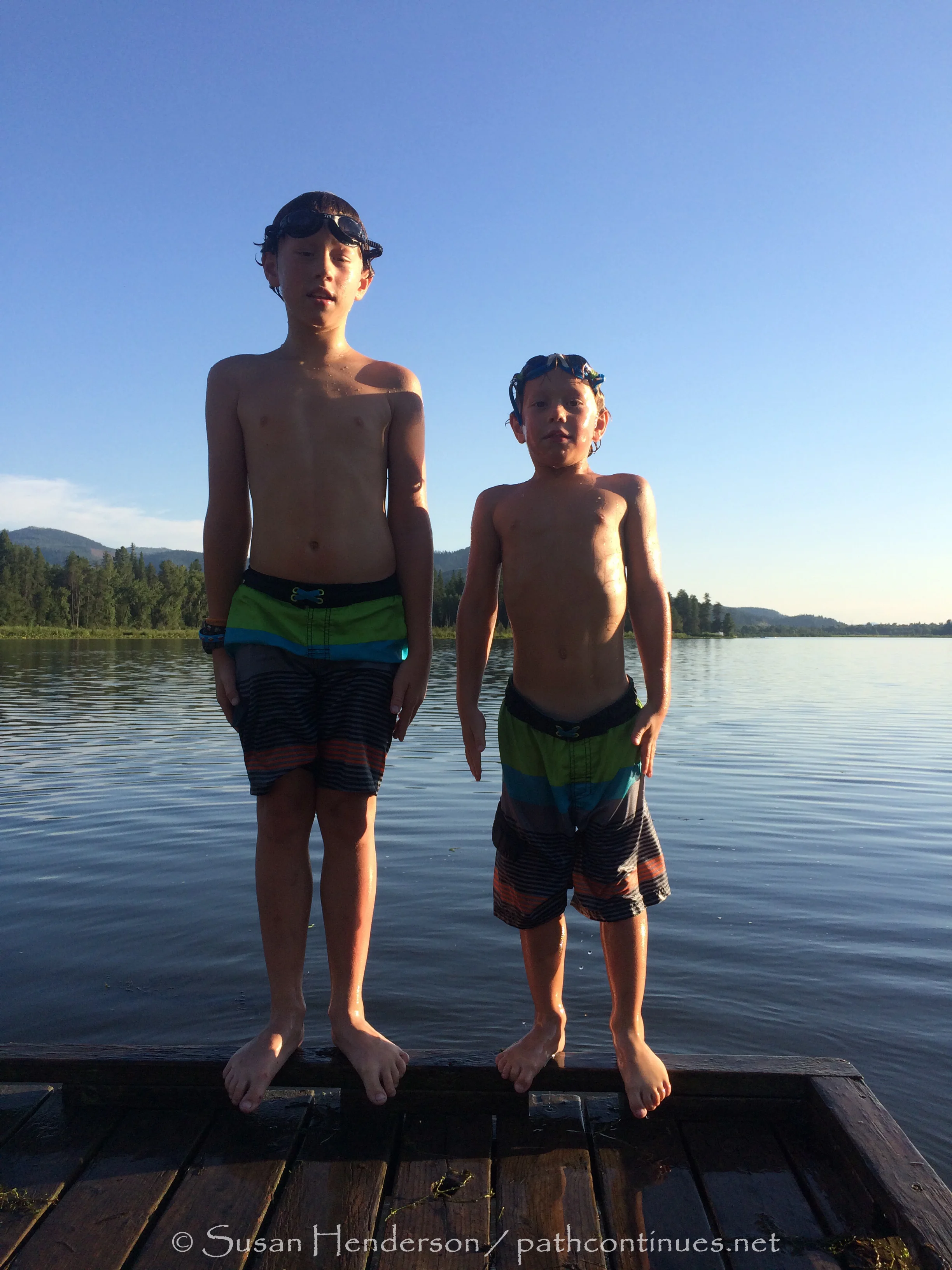 In Northern Idaho for the last week of our trip with the boys. Bob has been following a great site on the web, freecampsites.net, and found us this little piece of paradise right on Rose Lake. There is only one site by the water, and fortunately we got here early enough in the day that it was wide open for us. There are a few other sites across the lake by the boat ramp, but they do not have the shade this one does, nor are they right on the water. After the last two weeks at Jellystone Park in Missoula, the quiet here is exactly what we needed. The boys ride their bikes up and down the dock, and so far, as of the time of day I am writing this, they haven’t ridden off the edge YET! They have waded out into the water, and cannonballed off the end of the long dock. Carson has tried his best to catch a fish with his hands. I don’t have the heart to tell him it probably won’t happen.